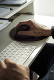 Close up of young son looking at dads computer while he works at home