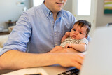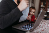 Close Up Of A Father Holding A Baby While Using The Computer