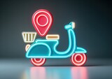 Neon Scooter With Location Pin And Basket For Delivery Service On Dark Background Glowing Blue And Red Lights