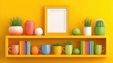 Colorful shelves with plants, books, mugs, and empty frame on yellow background