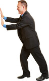 Geschäftsmann im Profil drückt gegen oder schiebt imaginäre Wand