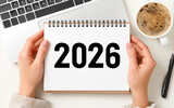 year planning concept hands holding notebook with future date coffee and laptop on white desk top view