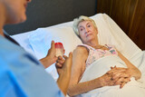 Caregiver assisting elderly patient in rehabilitation facility monitoring health