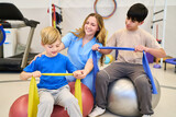Pediatric Physical Therapy Session with Children, Rehabilitation Exercises, Therapist Assisting Patients with Resistance Bands, Motor Skills Training, Balance on Exercise Ball