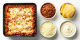 A cooked bolognese lasagna with ingredients