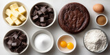 A cooked brownie cake with ingredients