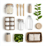 Flat lay of eco-friendly items isolated on white background