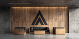 An office lobby or waiting room with a wooden aesthetic. The image is a mockup for a company wall logo.