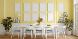 A dining room with a bright wall, on which multiple square frames are arranged in a symmetrical pattern. The image is a mockup.