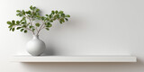 A white wall with a shelf. A vase and a green plant are on the shelf. The image is a mockup.