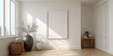 A white home interior with a mockup frame is shown. The room is bright and has minimal decor.