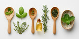 Flat lay of kitchen herbs and tools isolated on white background.