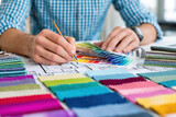 Designer Working With Color Swatches Pencil and Blueprint on Desk for Interior Design Architecture or Creative Projects in the Workplace