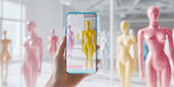 Person holding smartphone in front of colorful mannequins with augmented reality