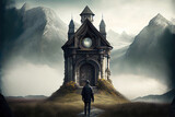 Wanderer exploring eerie chapel in foggy mountains (Generative AI)