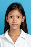 Passport ID portrait of a young Asian Vietnamese girl against a blue background
