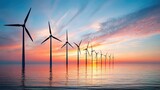 Wind turbines located in an ocean creating renewable energy during a vibrant sunset