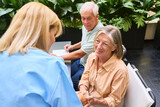 Happy seniors meeting with a healthcare professional at a rehabilitation facility