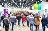 Blurred Crowd Of People Walking At Trade Show Or Business Conference Event Indoors Exhibition Hall With Many Visitors And Bright Lights