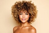 Portrait Of Beautiful Woman With Curly Hair On Beige Background Beauty Shot For Cosmetics And Hair Products Advertising Campaigns