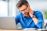 Man With Neck Pain Using Laptop Computer At Desk In Office Suffering From Stiffness And Discomfort After Work Healthcare Concept