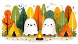 Whimsical fall camping scene with two cute ghosts, tents, and a campfire in a colorful autumn forest