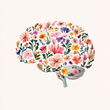 Artistic floral brain illustration with colorful pastel flowers on light background