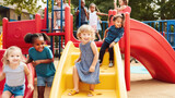 Group of happy children playing on playground in summer