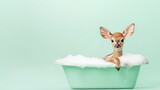 Adorable fawn in a bathtub surrounded by fluffy white bubbles
