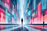 Futuristic neon-lit cityscape with a lone figure walking through a vibrant street