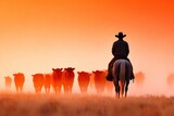 Cowboy herding cattle on horseback at sunset in a rural landscape