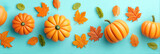 Bright pumpkins and colorful leaves arranged on a blue background