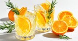 Fresh orange mocktails with rosemary garnished in crystal glasses on a sunny day
