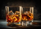 Two whiskey glasses with ice cubes in a warm illuminated setting