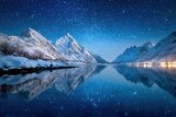 Starry nightscape over snowy mountains reflecting on a tranquil lake