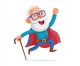 Joyful superhero senior enthusiastically leaping with a cane and a cape