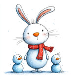 Adorable rabbit in a red scarf with snowman companions in winter setting