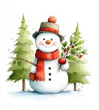 Festive artwork featuring snowmen and holiday decorations in winter surroundings