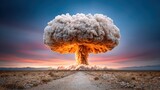 Dramatic atomic explosion rising above a remote arid desert landscape