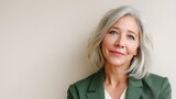 Portrait of a smiling transgender model with salt-and-pepper hair wearing a stylish suit against a pink background, exuding confidence and joy