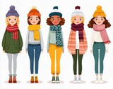 Five women in colorful winter outfits standing together with scarves and hats, smiling and stylish
