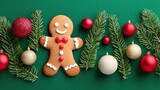 Gingerbread Man Cookie With Christmas Ornaments And Pine Branches On Green Background For Holiday Season And Festive Decorations