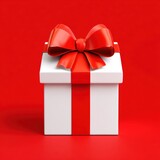 Elegant white gift box with red ribbon bow on a red background, perfect for gifts