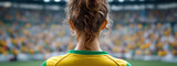 Joyful young woman in green blouse against vibrant yellow backdrop