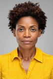 Studio shot ID portrait of Nigerian woman with natural hair in yellow shirt