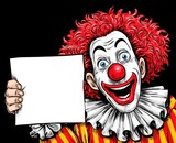 Cartoon Clown Holding Blank White Sign With Red Hair And Striped Costume On Black Background For Circus Or Party Invitations
