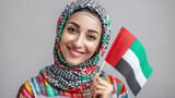 Smiling Emirati Woman Holding a Flag and Wearing a Vibrant Traditional Hijab
