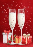 Champagne Glasses With Gift Boxes And Roses On Red Background For Romantic Celebrations And Valentine's Day Events