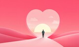 Pink Heart Shaped Portal With Man Silhouette And Sunrise Background For Valentine'S Day And Romantic Concepts