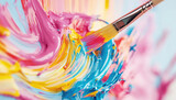 Close-up of colorful paint strokes on canvas with a paintbrush